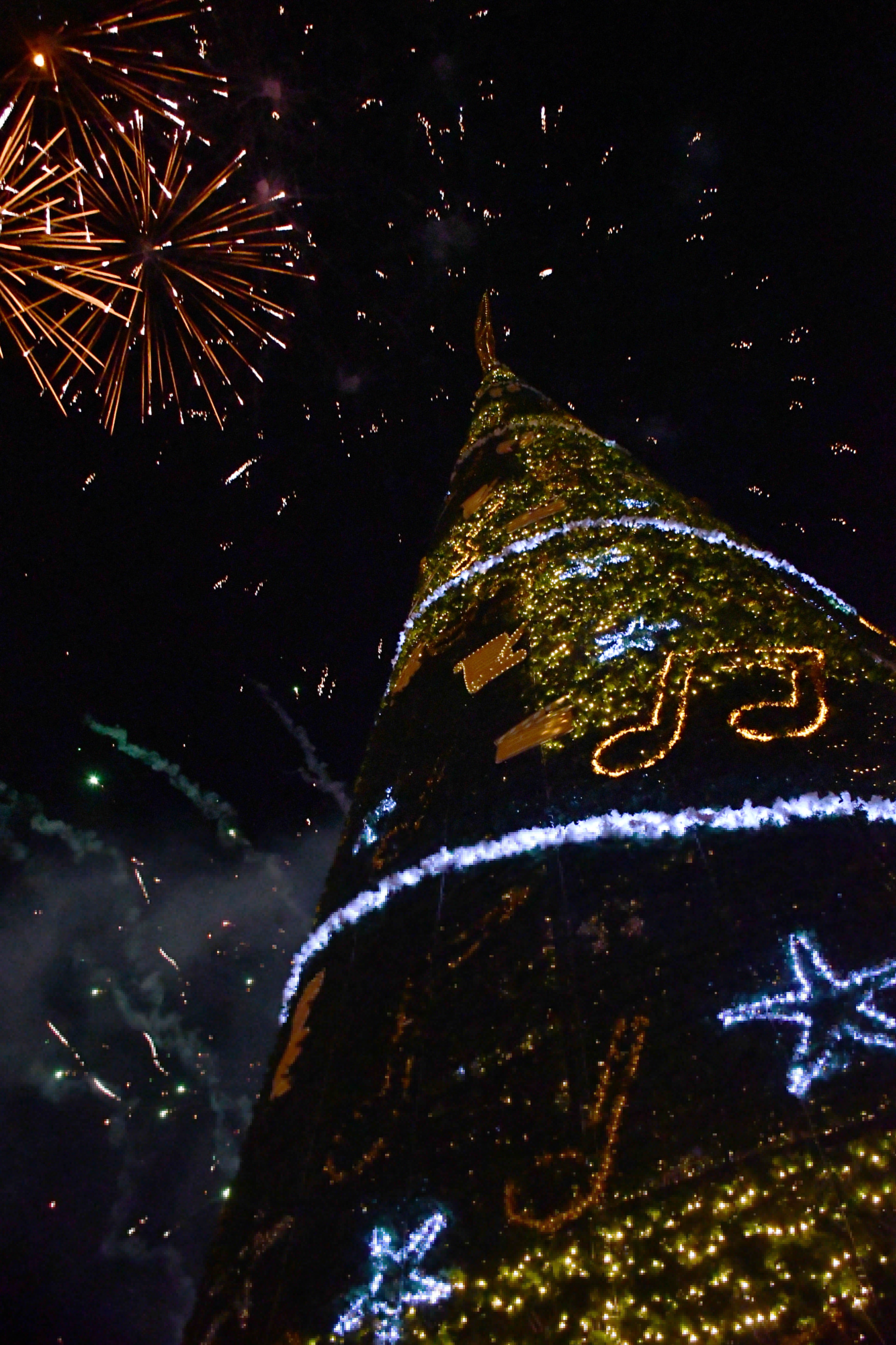 Después de la cuenta regresiva para presionar el botón e iluminar las 90 mil luces led del Árbol de Navidad, de 30 metros de altura, con 7 mil 200 metros cuadrados de escarcha, 186 series de 500 luces cada una y figuras alusivas a las bellas artes, la Rectora Lilia Cedillo Ramírez dio un mensaje de paz y compartió sus mejores deseos para el año venidero.