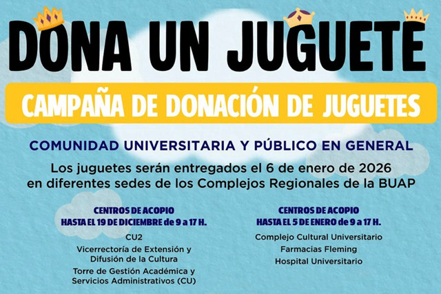 Este año, nuevamente la BUAP convoca a la comunidad universitaria y al público en general a participar en la campaña “Dona un Juguete”, la cual tiene como fin ayudar en su labor a los Reyes Magos y brindar este 6 de enero de 2026 alegría a niños y niñas de municipios y localidades marginadas del estado de Puebla.